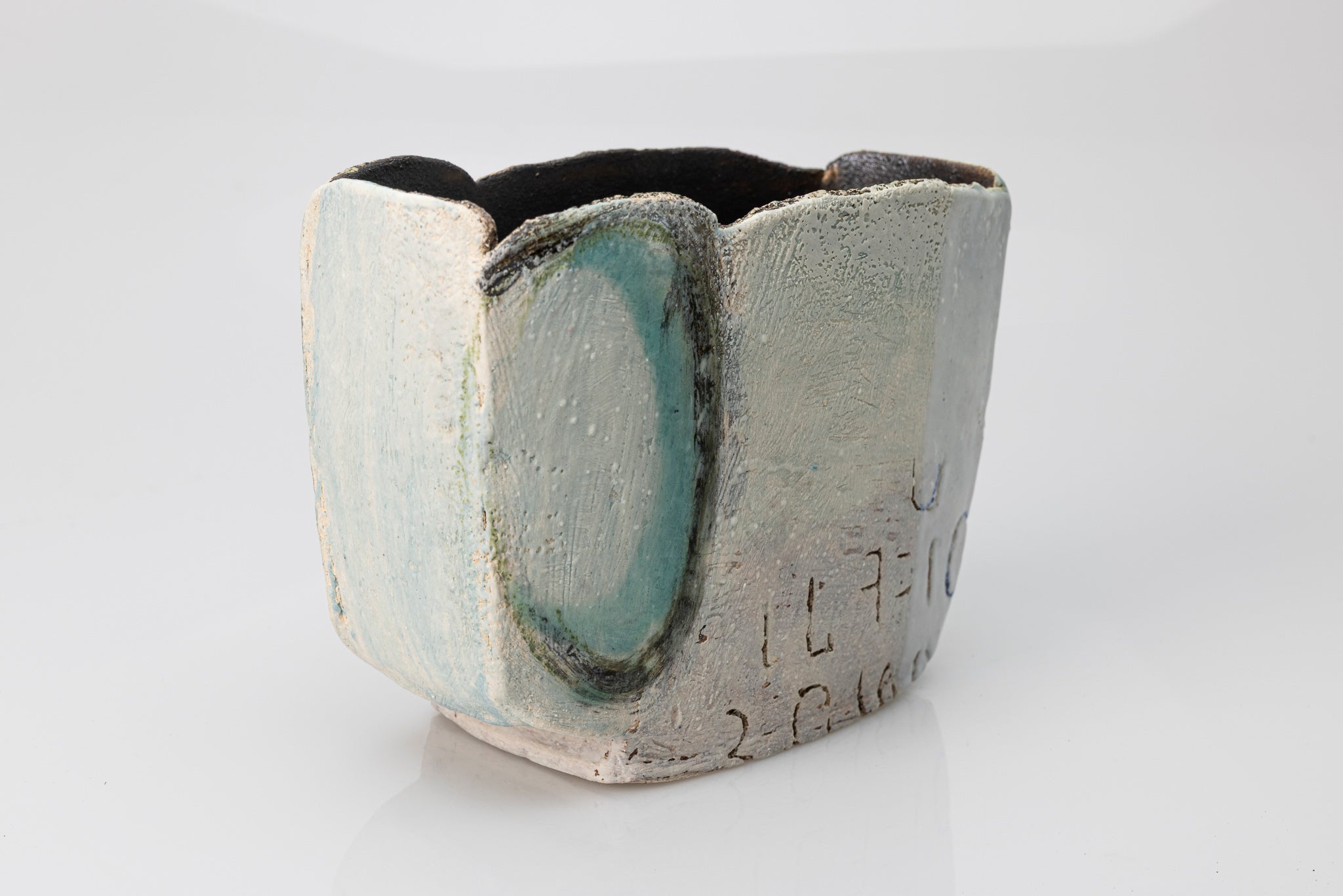 Medium: Slab built vessel with incised lines, engobes, underglaze, glaze and oxides. Fired to 1140°C