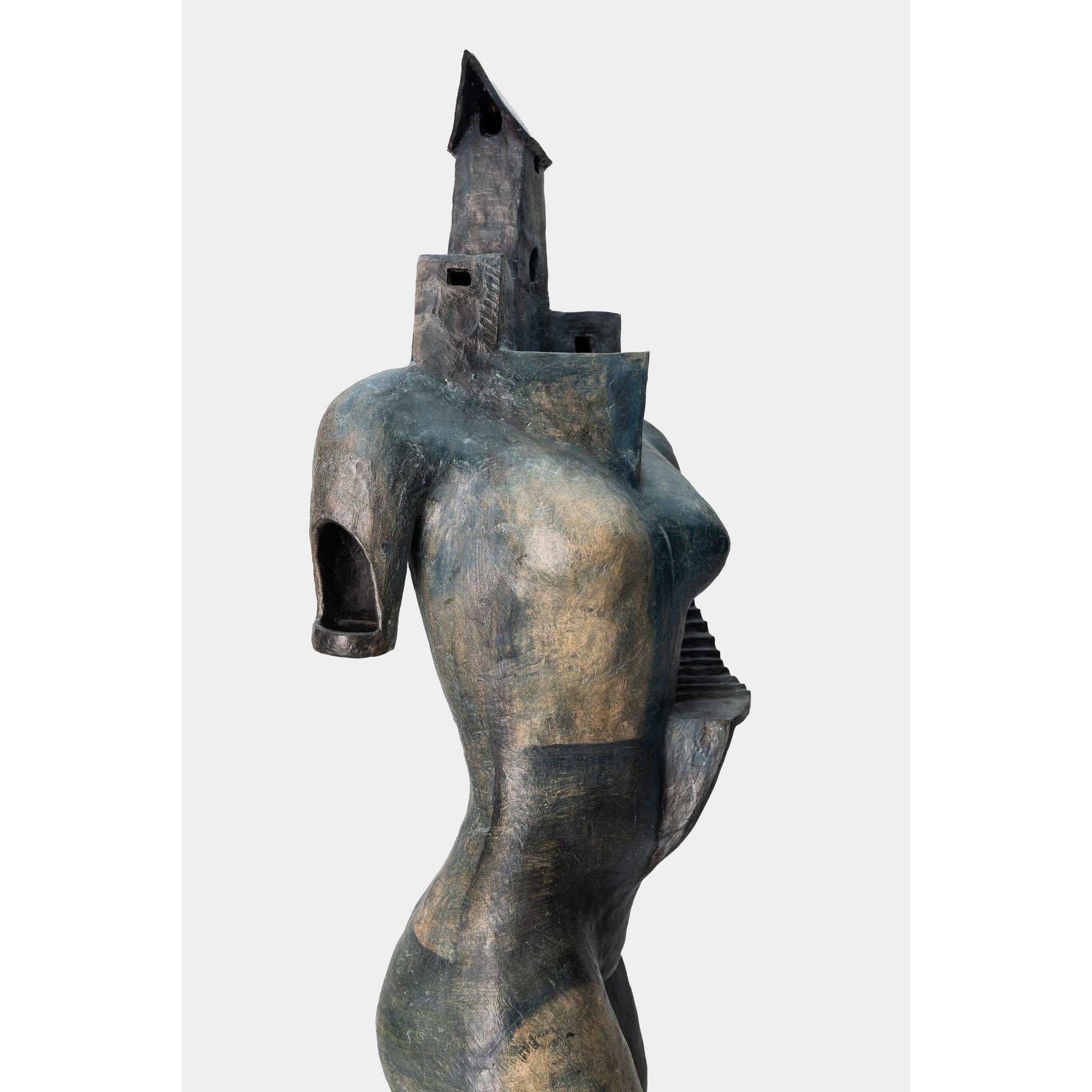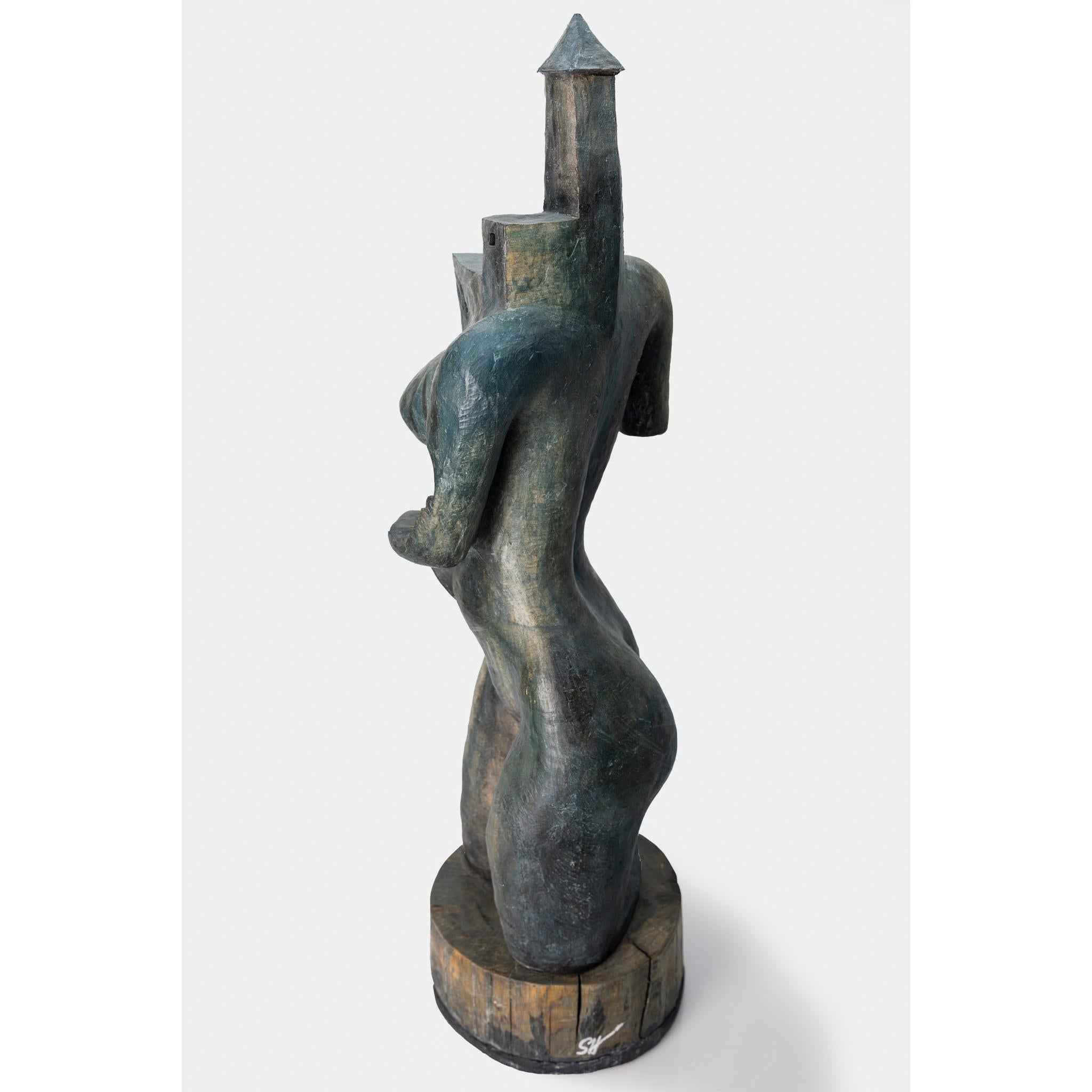 Medium: Blue ceramic woman/tower on timber plinth. Original
