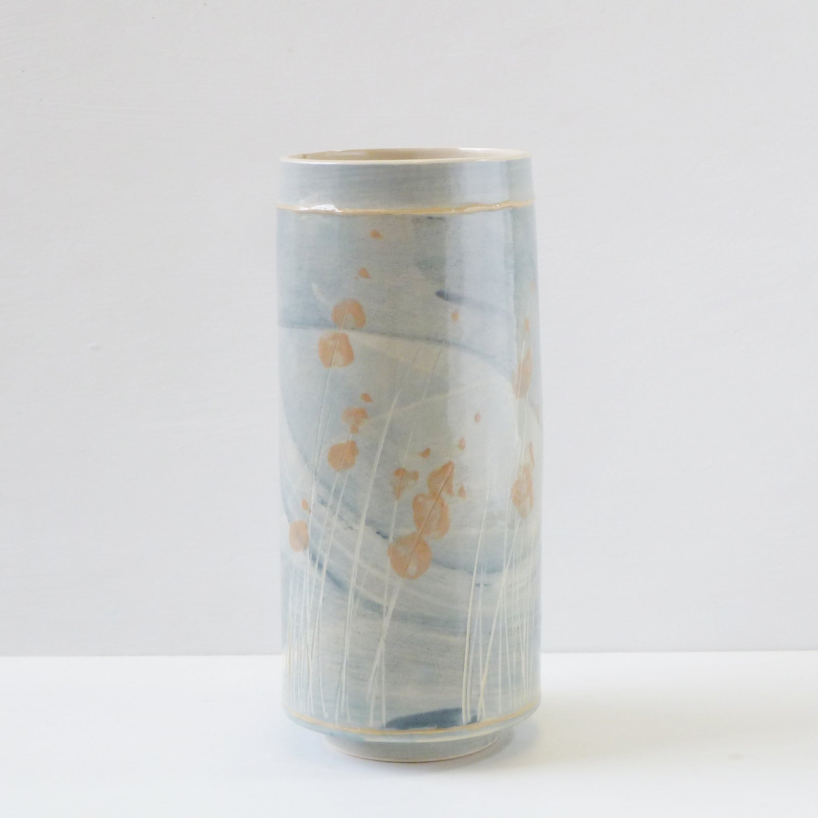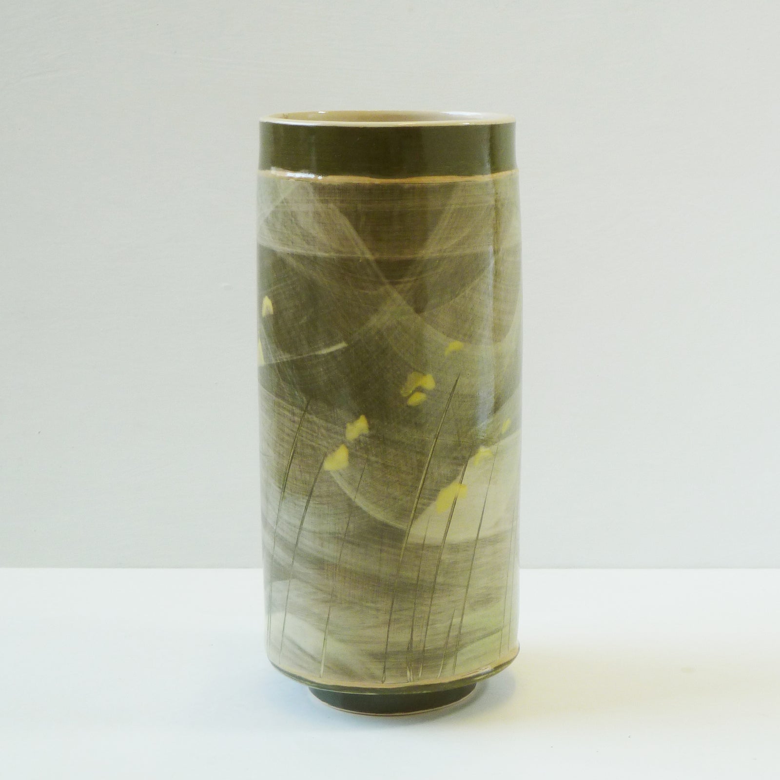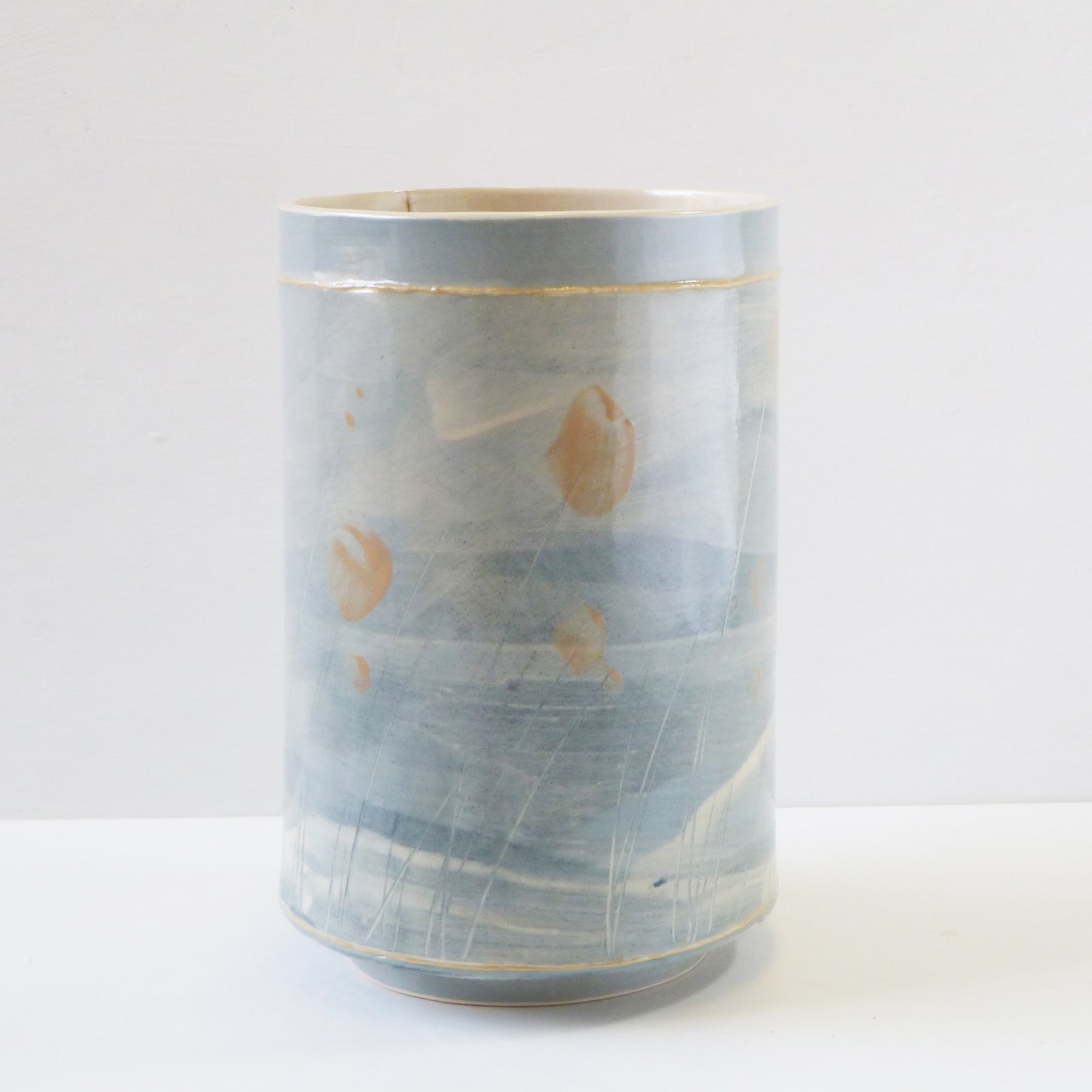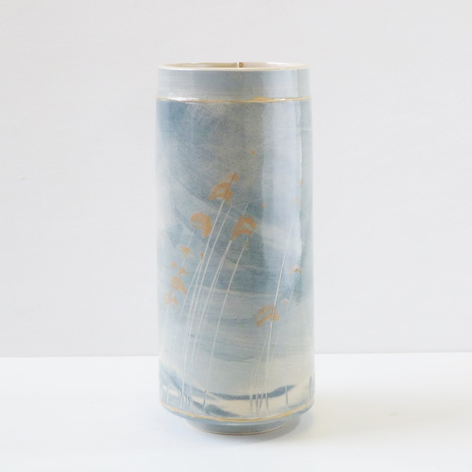 The colours and textures of the ever-changing skies, seas, coastline and accompanying landscape are a constant source influencing her explorations within the ceramic materials, where each vessel becomes its own painting and can reflect a particular moment in time. The flick of a paintbrush for