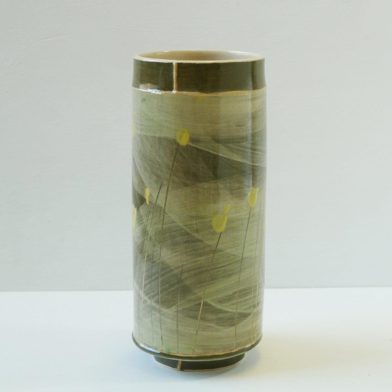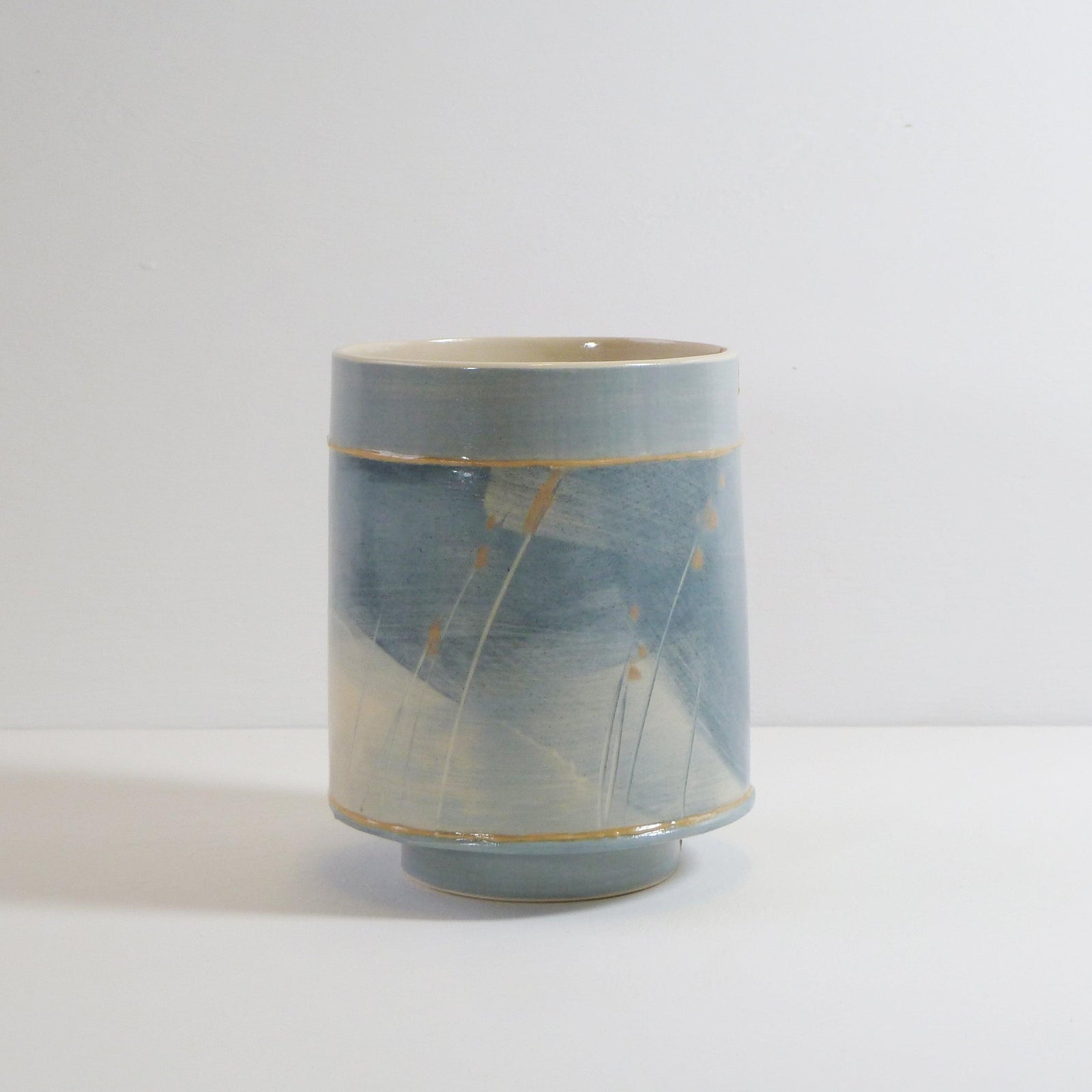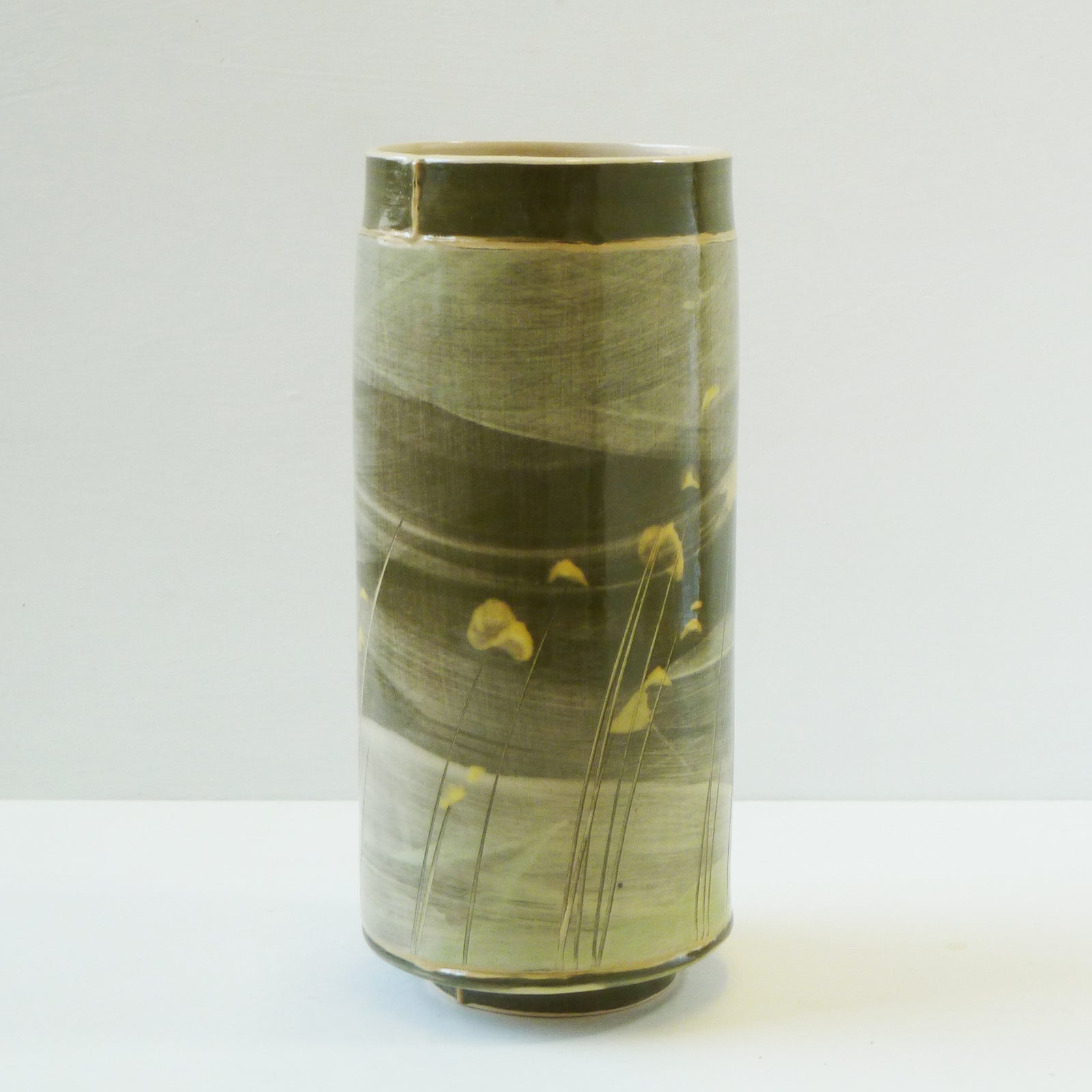The colours and textures of the ever-changing skies, seas, coastline and accompanying landscape are a constant source influencing her explorations within the ceramic materials, where each vessel becomes its own painting and can reflect a particular moment in time. The flick of a paintbrush for