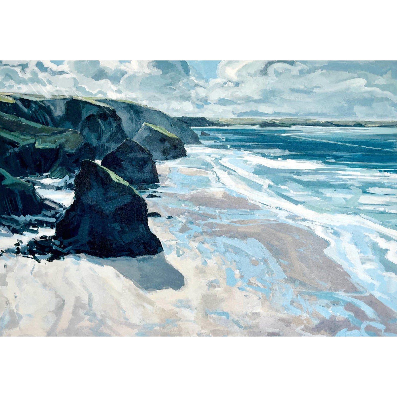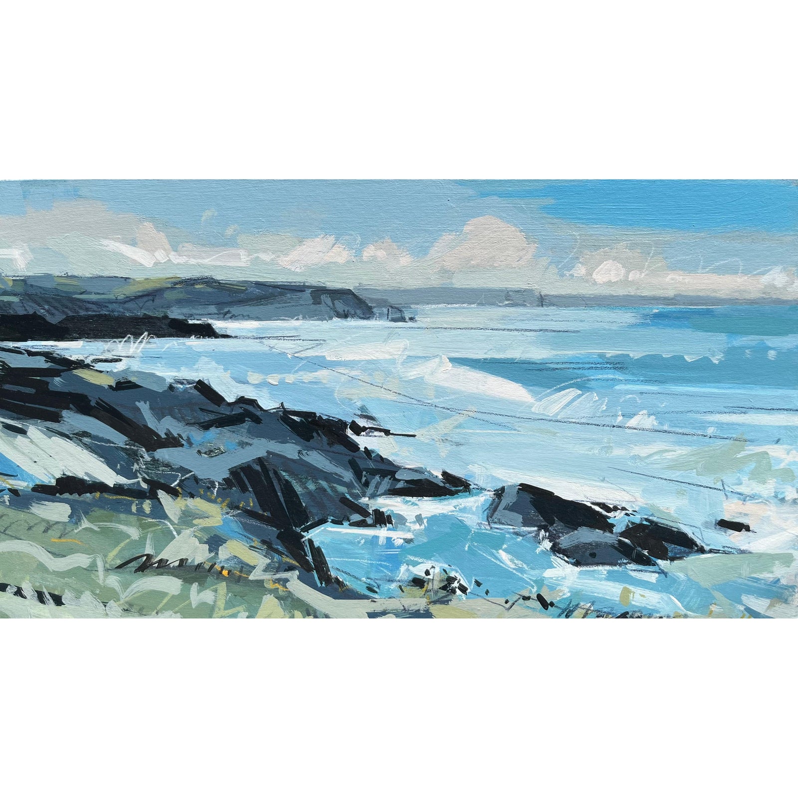 'Originally moving to Cornwall to Study at Falmouth College of Art I fell in love with Cornwall, and the sea. The coast makes me feel free and allows me to paint with the energy that it gives. The storms that have such an impact on our coastline offer up a palette of opaque greys, greens and purples. The summer takes us through open clear skies and sparkling translucent waters putting those turbulent times behind us. Returning to Cornwall is always a fresh and welcoming feeling'.