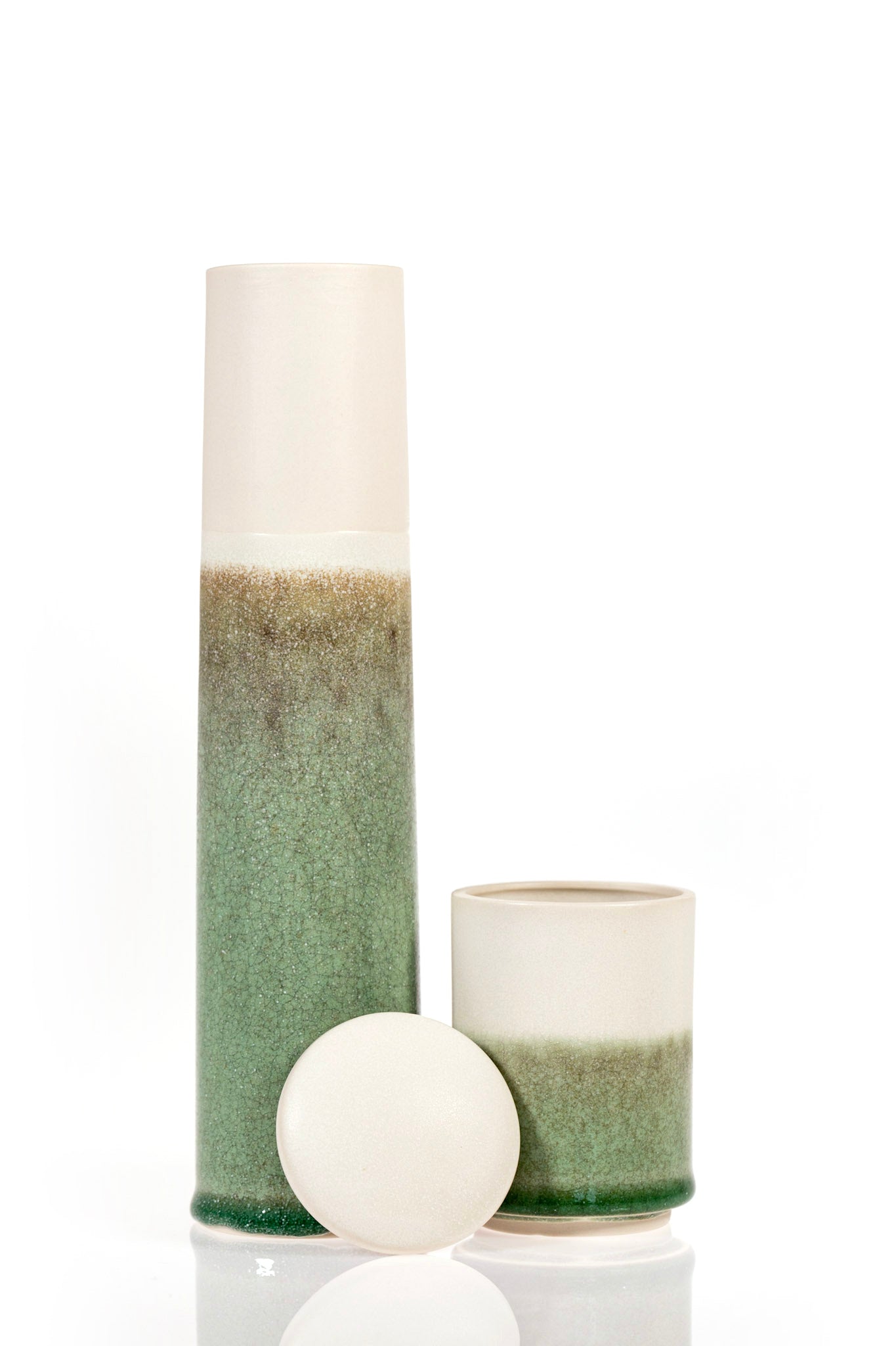 Kate’s ceramics are renowned for their distinctive sculptural qualities, often comprising a series of repeated forms or collections. The passage of time and the ability of certain objects to connect us with our past are continual sources of inspiration for her work in clay. Her collections of jugs, tapered vessels and containers are conceived as small scale installations. Wood, stone and precious metal gilding are used in combination with the ceramic pieces to create a sense of balance and harmony. Applying glaze like layers of fabric to partly wrap the ceramics, Kate highlights the surface qualities of each piece, creating a subtle interplay between light and dark.